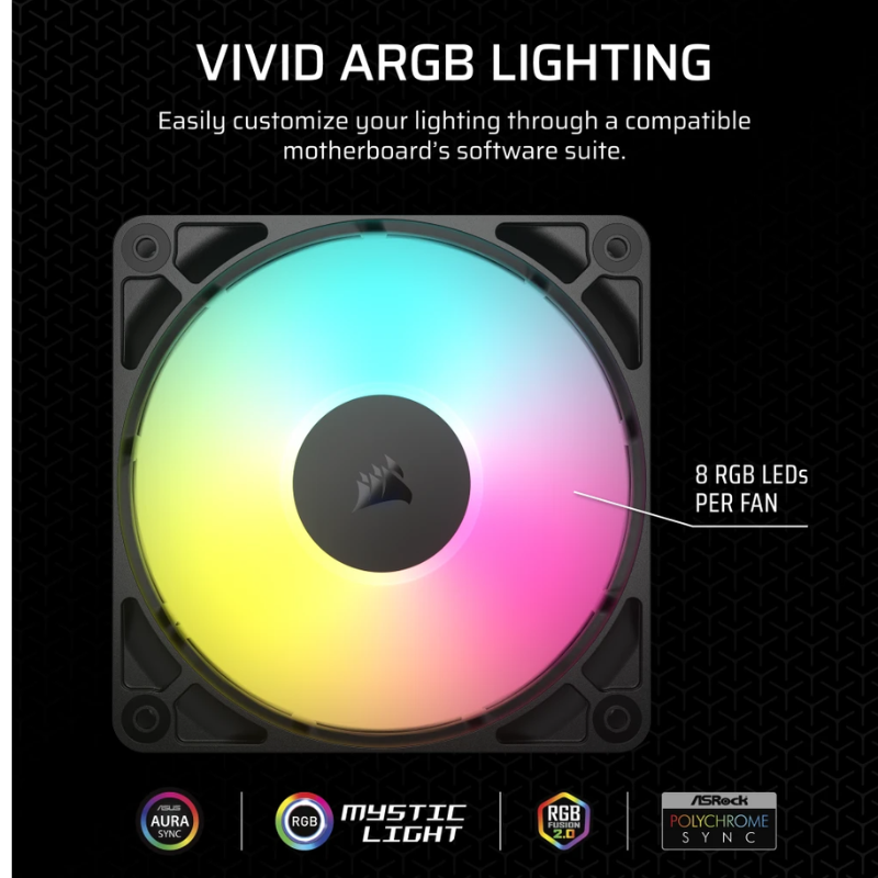 Đèn nền ARGB tuyệt đẹp: Mỗi quạt được trang bị đèn nền ARGB (Addressable RGB) có thể tùy chỉnh độc lập thông qua phần mềm iCUE, cho phép bạn tạo ra vô số hiệu ứng ánh sáng độc đáo, đồng bộ với các linh kiện iCUE khác trong hệ thống.